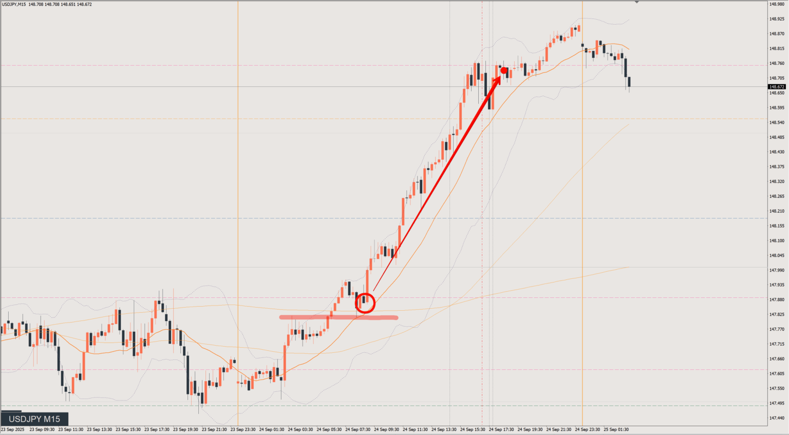 エントリー後はほぼ一直線に上昇して目標到達しますが、目標のラインで陰線が出るわけでもなく上昇していくのでホールドします。