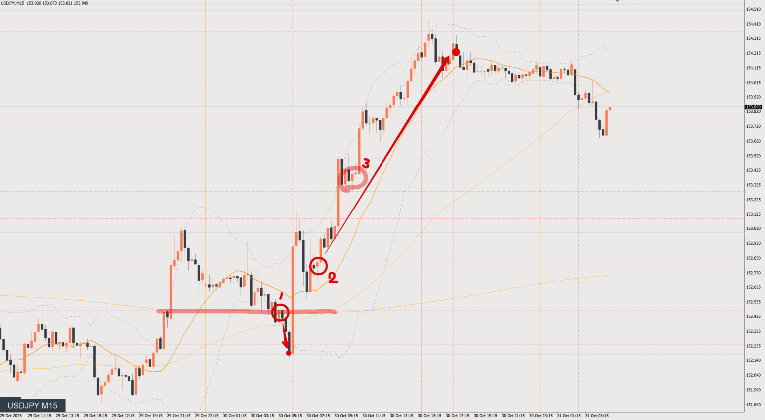 2025/10/30 ドル円トレード戦略 15分 チャート